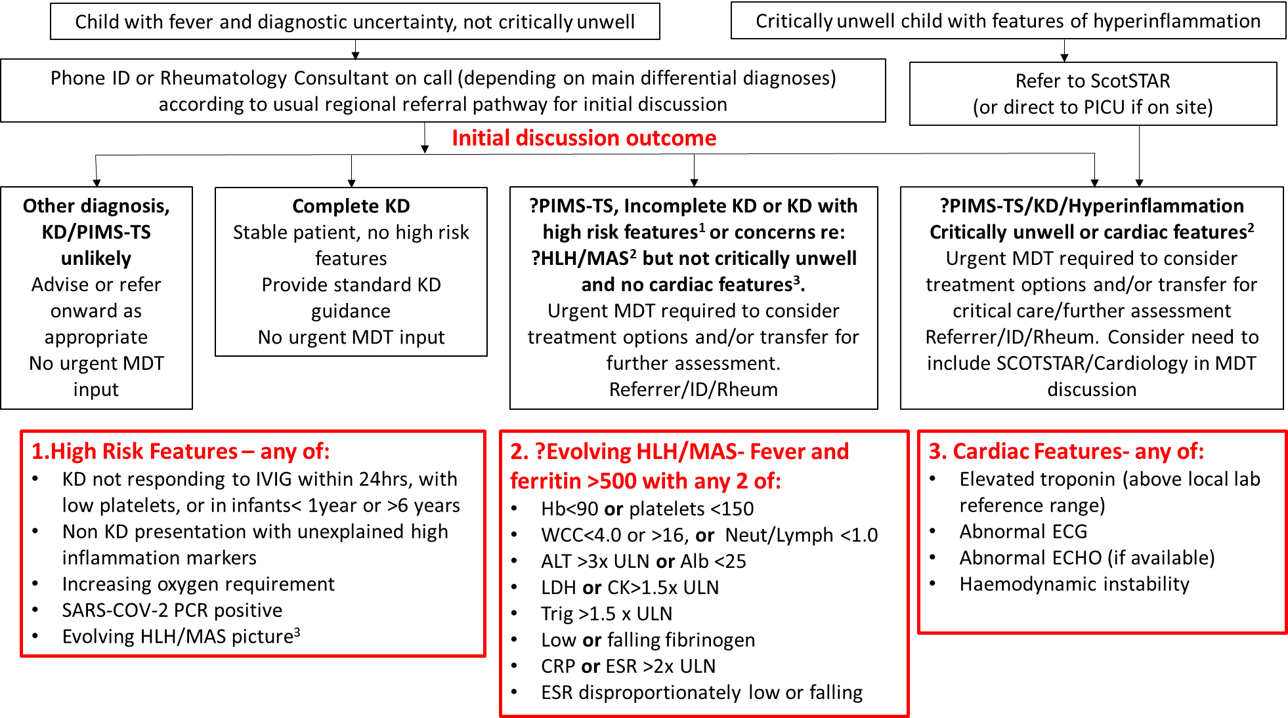 Initial referral should be by telephone to the on-call consultant for either Infectious Diseases (ID) or Rheumatology via switchboard at RHC, Glasgow or RHSC, Edinburgh according to usual regional referral pathways. Broadly speaking, initial discussions should be with ID if differential diagnoses are thought to mainly include acute COVID-19 or other infections, or with Rheumatology if differential diagnoses are thought to mainly include systemic rheumatological or inflammatory conditions. However, given the overlap in differential diagnoses either service welcomes initial discussion.