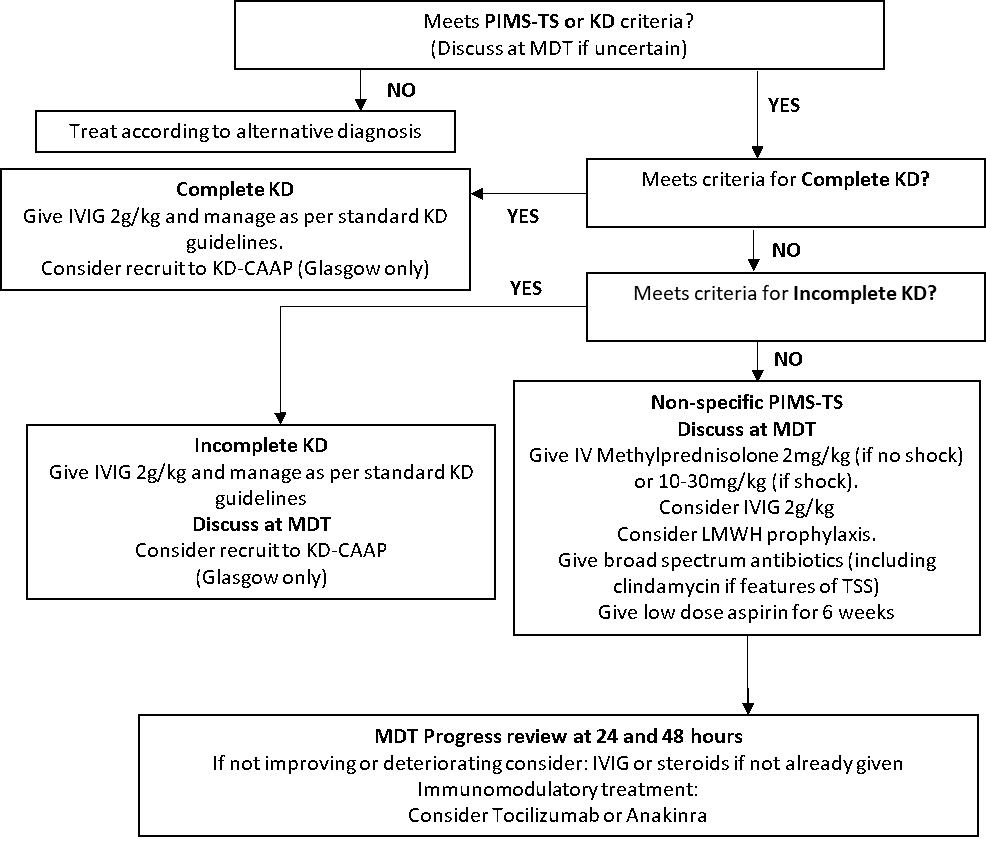 Children who meet AHA criteria for incomplete KD as defined above should be treated with IVIG, high-dose aspirin and cardiac follow-up in accordance with standard KD guidelines. Given the overlap with non-specific PIMS-TS and other conditions, children with Incomplete KD should ideally be discussed at MDT to agree that criteria for this diagnosis are met. In Glasgow, they should be considered for the KD-CAAP trial.